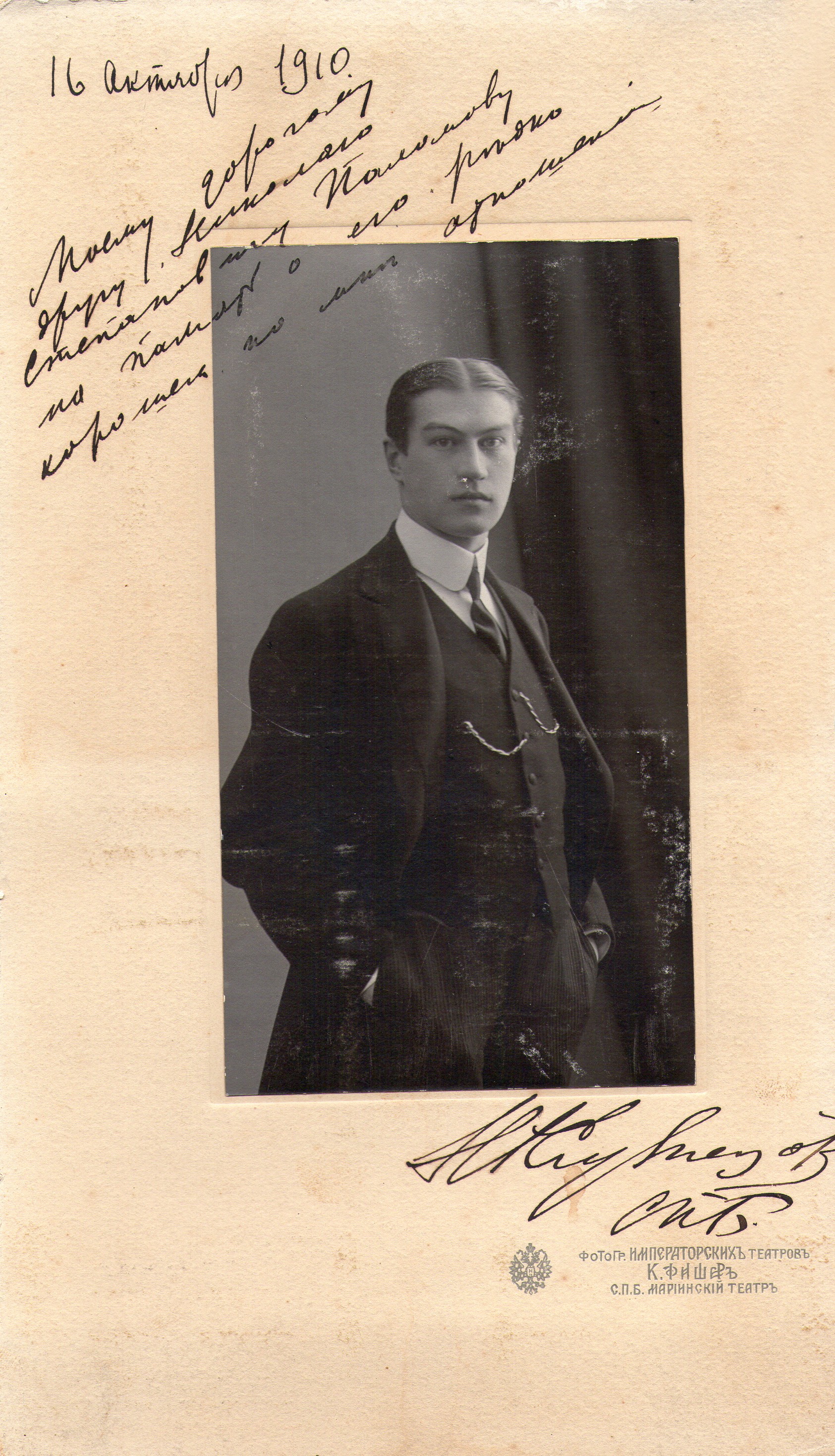 Фотография наклеенная на лист паспарту. Дарственная надпись: «16 октября 1910 / Моему дорогому / другу Николаю / Степановичу Паломову / на память о его редком / хорошем ко мне отношении / Н. Куприянов / СПБ.».
