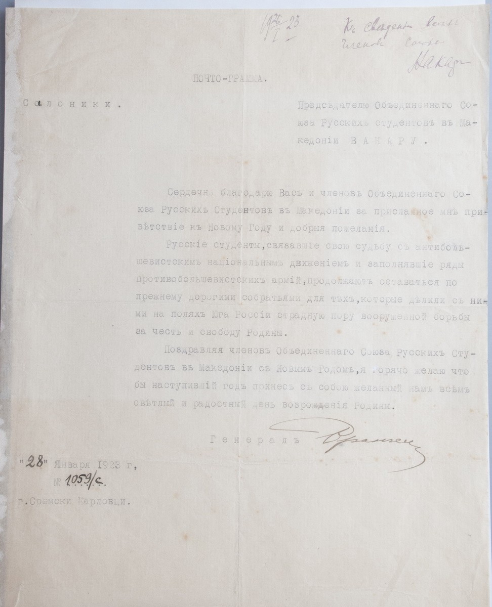 Барон Пётр Николаевич Врангель (1878-1928) — генерал-лейтенант, один из главных руководителей Белого движения в годы Гражданской войны. Главнокомандующий Русской армии в Крыму и Польше (1920). В своей почтограмме он отвечает на новогодние поздравления Союза Русских студентов с новым 1923 годом благодарностью и взаимными поздравлениями.