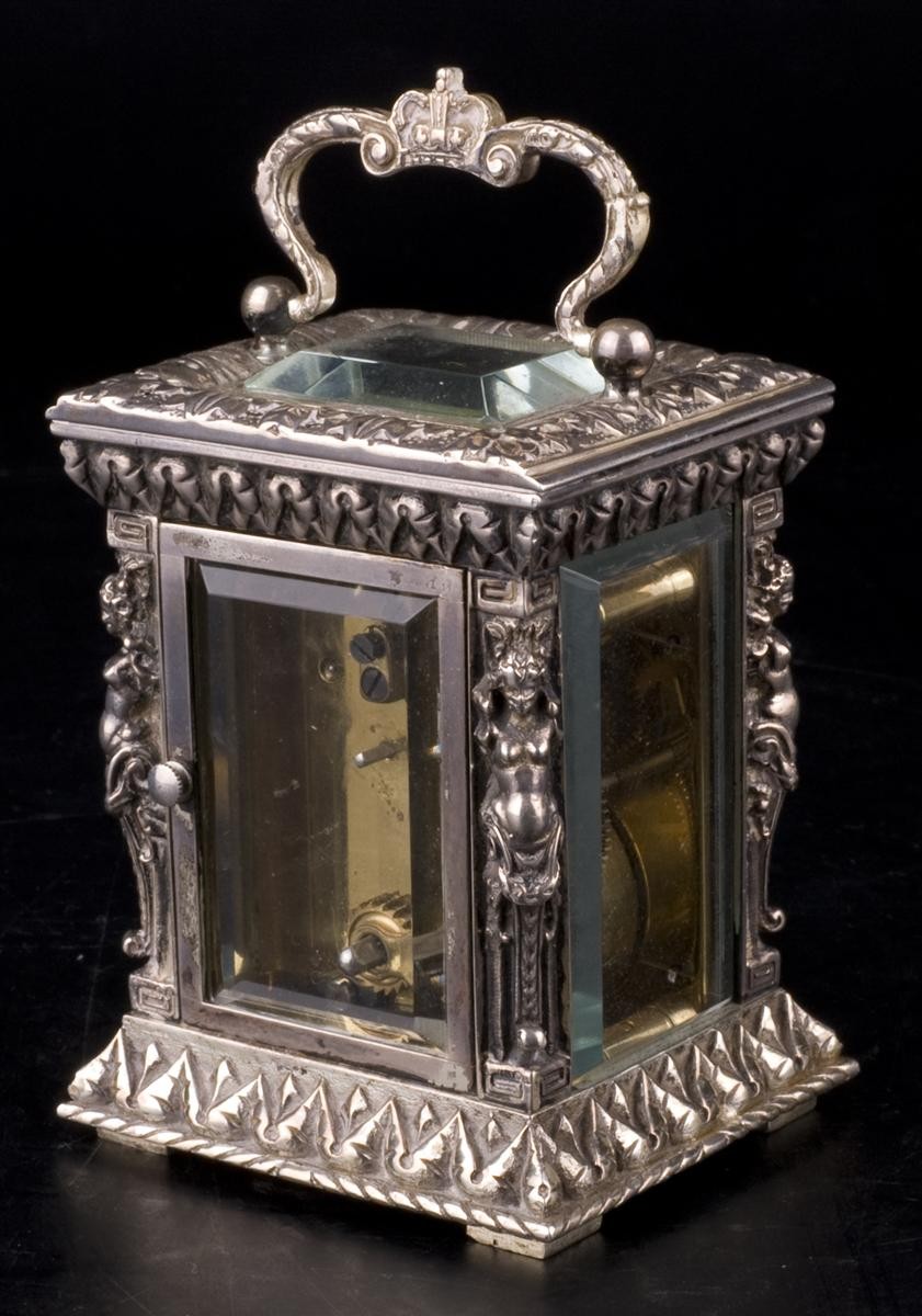Англия, Лондон, кон. XIX в. Белый металл, серебрение, рельеф, чеканка, монтировка. На циферблате надпись «Chas. Frodsham London». Размеры: 8,9х6х5,5 см. Сохранность хорошая.